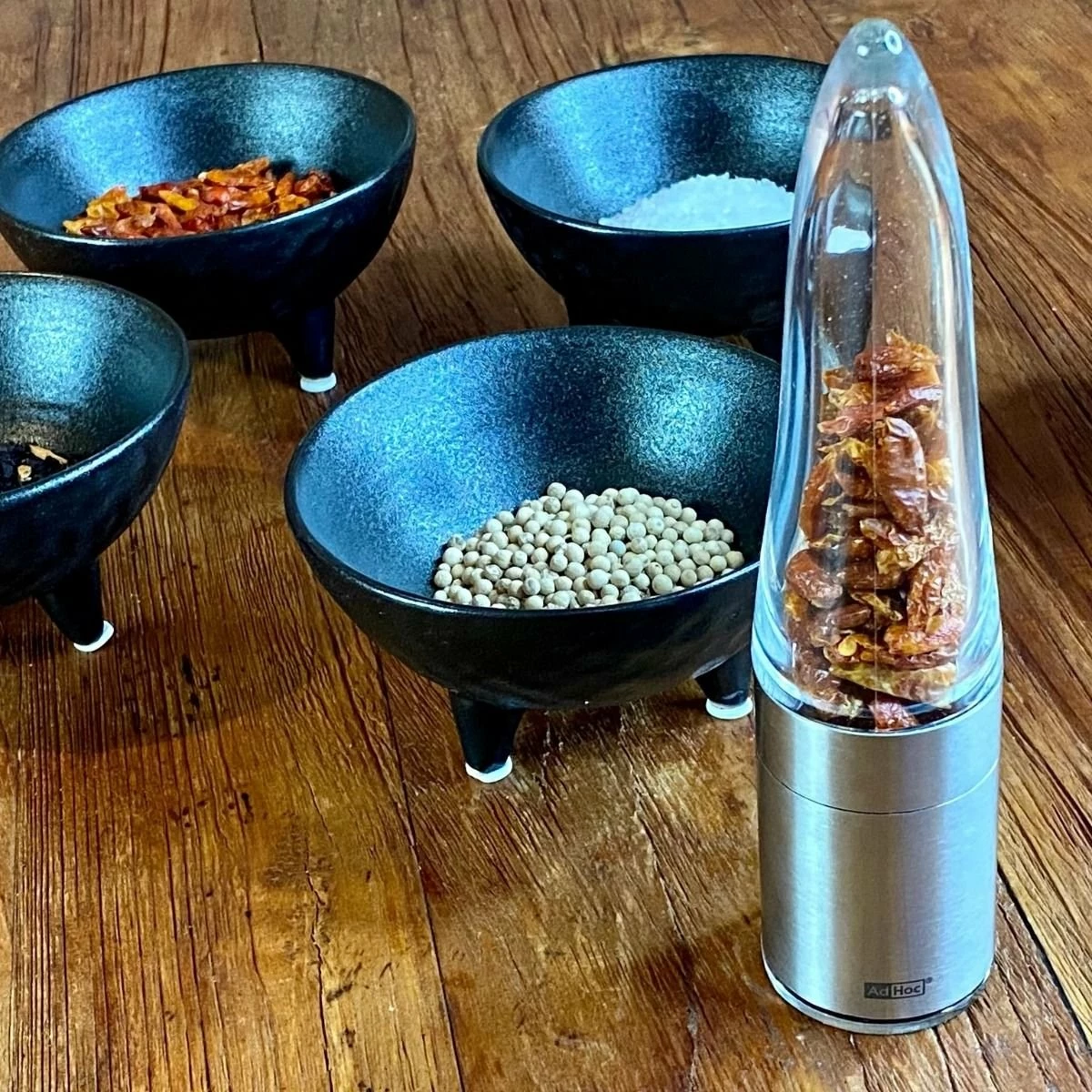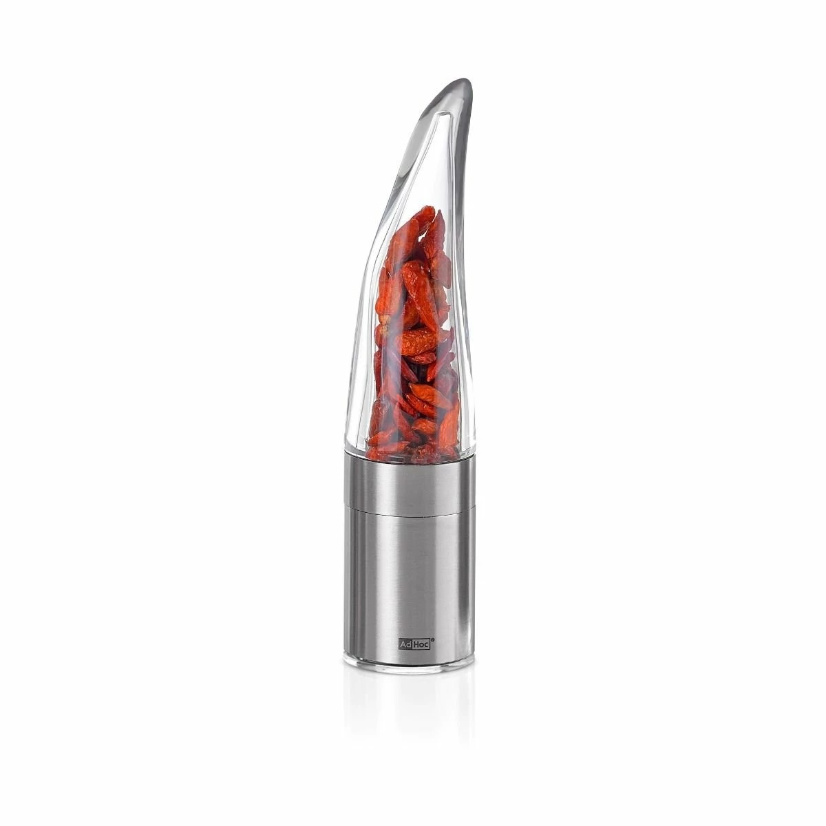 Add flavor and heat to any meal with the AdHoc Chili Cutter! Made from stainless steel and acrylic and featuring a cute pepper shape, this chili cutter is both durable and stylish. This cutter features the AdHoc PreciseCut® system, which cuts rather than grinds chilies, herbs, and spices to preserve oils and maintain a fresh flavor. This cutter is perfect for dried chilies such as Bird’s Tongue, African Devils, Piri Piri, and more, as well as dried herbs and spices such as fennel, coriander, and mustard seed. The aroma-sealing bottom cap maintains freshness and keeps your counter or table clean, while the acrylic body offers a clear view of the spicy contents. Whether you’re a connoisseur of exotic peppers or a fan of flavor, the AdHoc Chili Cutter makes it easy to kick your dish up a notch!