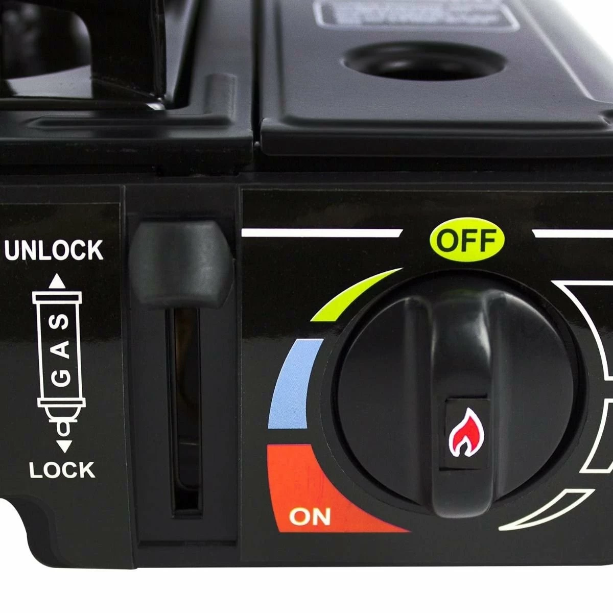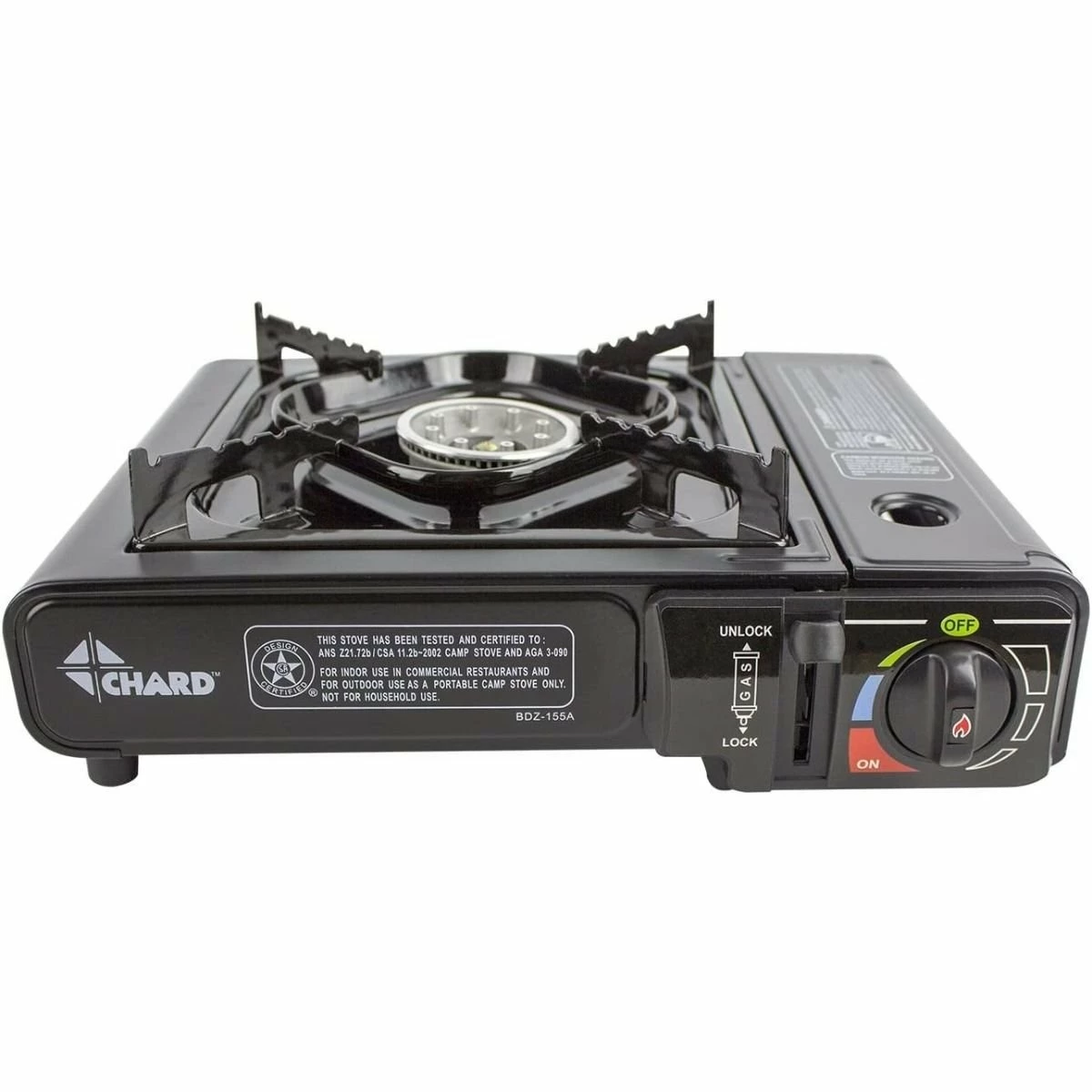 The Chard Single Burner Butane Camp Stove is the perfect tool for on-the-go outdoor cooking. Portable and reliable, this camp stove is great for tailgating, camping and hiking. This stove features a butane cartridge locking system and safety shut off system. The Piezo-electric starter and fully adjustable heat-control dial ignites and regulates the flame. The burner provides an 8,500 BTU flame and the cooking area allows for one 10 Inch pan. Includes a portable carrying case with convenient canister storage. The drip tray surface is enamel to ensure easy clean up. CSA Approved. For outdoor use only.