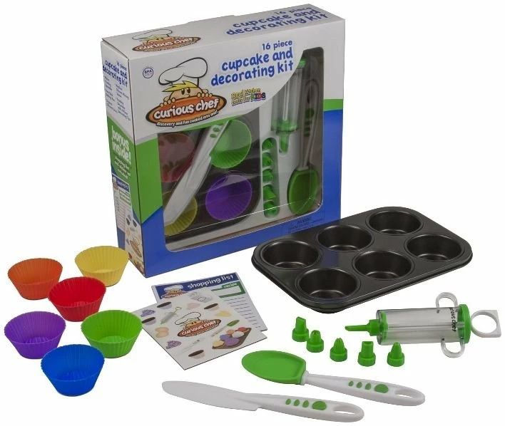 The Curious Chef TCC50165 cupcake and decoration kit comes with all the tools your child needs to create and decorate cupcakes in their own kitchen. This fun filled cupcake decorating kit incorporates the elements of safety and every piece is easy to grip for small hands. Curious Chef cupcake decorating kits include a 6 cup muffin pan, frosting decorator, 6 unique decorating tips, 6 colorful silicone cupcake liners, frosting spreader and a silicone spoon. The Curious Chef TCC50165 cupcake decorating kit is high quality and very easy to use. Get your new Curious Chef cupcake decorating kit today and join the fun!
