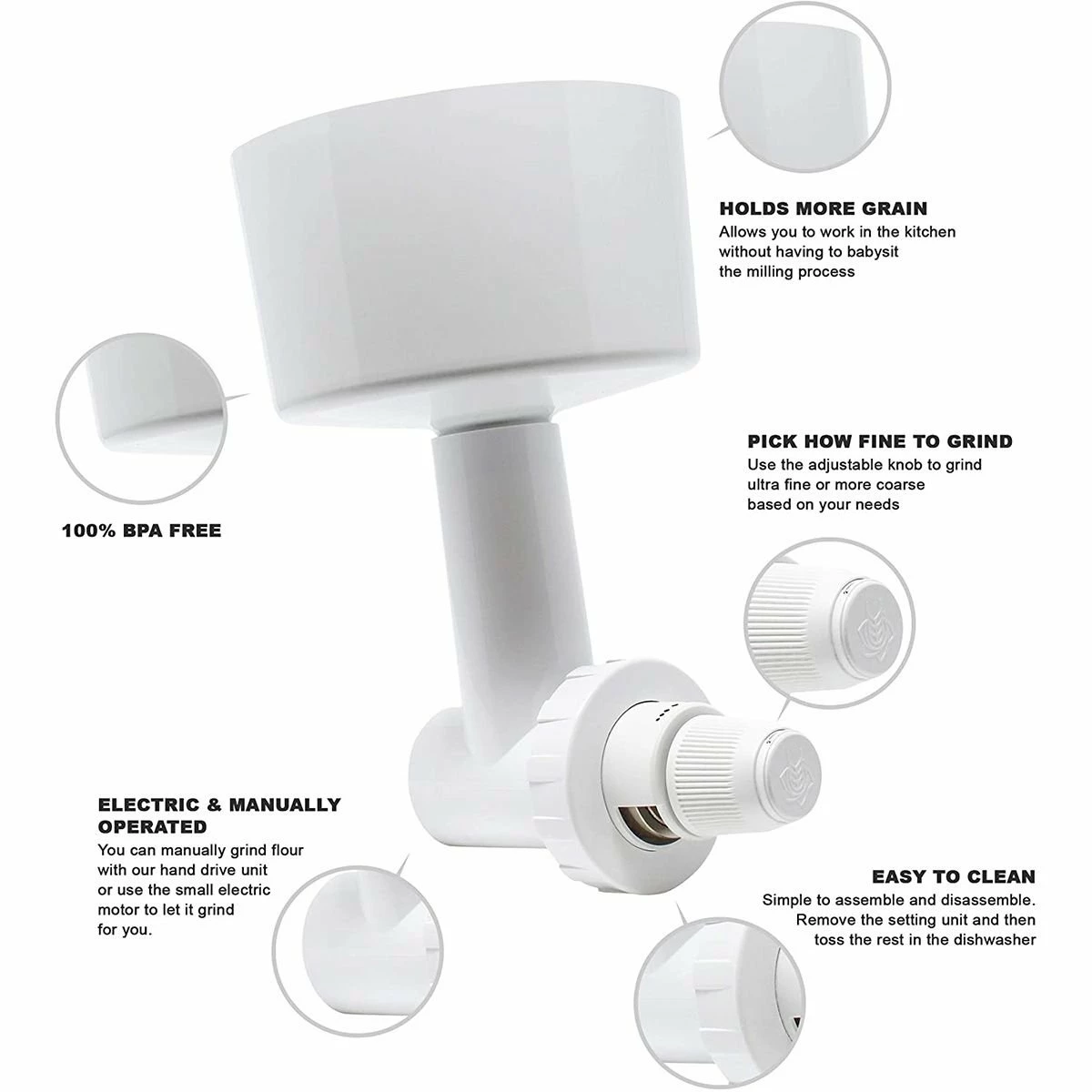 - This grain mill attachment contains no power source and must be connected to one of the following compatible bases: Family Grain Mill Hand Drive Unit, Family Grain Mill Motor Base, Wondermix Stand mixer, and Family Grain Mill Jupiter Motor Unit