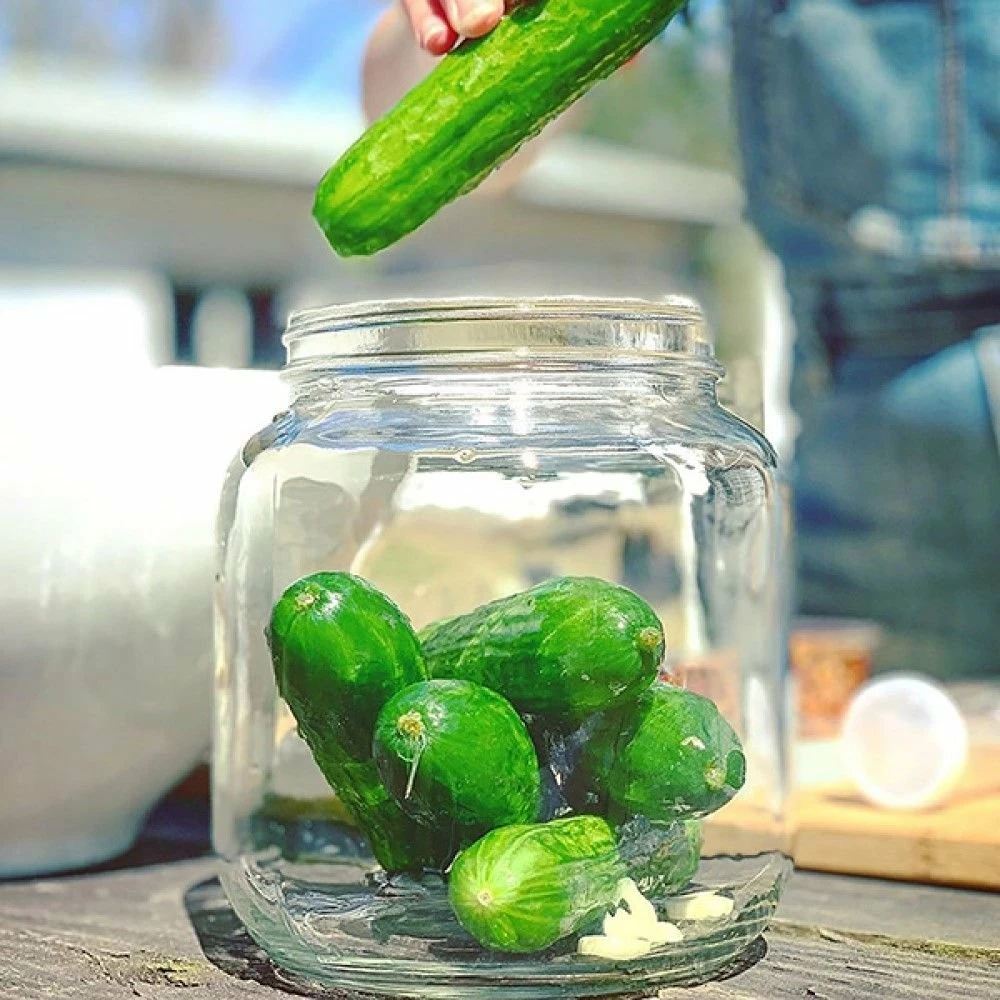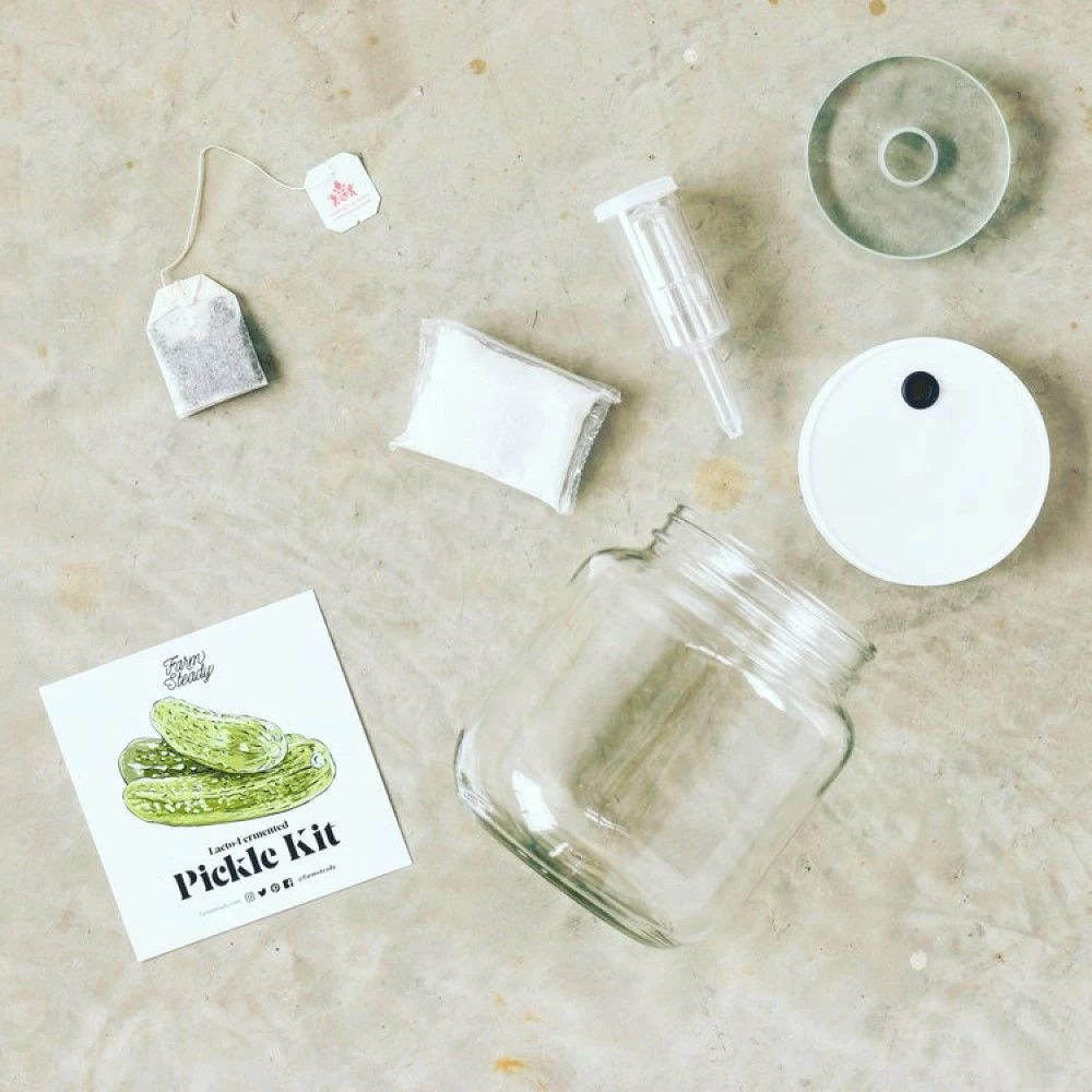 Turn fresh cucumbers into delicious (and healthy!) pickles with the FarmSteady Lacto-Pickle Kit! This kit includes the essential tools for pickling vegetables, including a 1/2 gallon glass fermenting jar, an airtight lid & airlock, a glass fermentation weight, a black tea bag, & kosher salt. Beyond being a tangy & delicious topping, or snack, pickled vegetables provide enhanced nutrients & are rich in naturally occurring probiotics that help maintain a healthy gut. Making your own pickles also gives you complete control over the flavor profile & salt content, allowing you to add your own spices & ingredients to craft a perfectly personalized batch tailored to your exact liking.