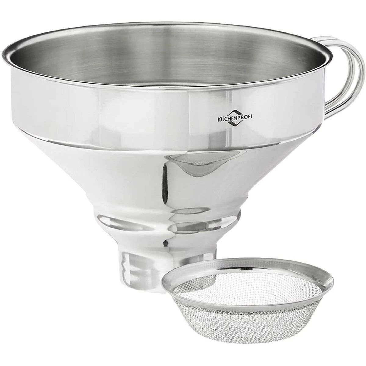 Canning is an age-old tradition that’s made a serious culinary comeback over the last few years. When you’re canning, making your favorite sauces, or just working on a gravy, you can avoid messes with the Funnel with Mesh Filter (5″ dia. x 3.5″) from Frieling! Designed by Frieling’s partner Küchenprofi for daily use, this funnel and filter set is made of durable, highly sturdy, high quality 18/8 stainless steel built to last. The included fine mesh filter is made for easily clarifying gravy and trapping seeds and impurities from whatever you’re making. The wide mouth of the funnel prevents spills and messes, ensuring that those counters stay clean while you cook! And after you’re done canning up all your favorite sauces and preserves, the entire assembly of the funnel and filter is completely dishwasher safe, making cleanup a breeze. Don’t try to pour straight from the pot just to end up with a mess! Can your foods the clean way. Order your very own Frieling Funnel with Mesh Filter 5″ dia. x 3.5″ today!