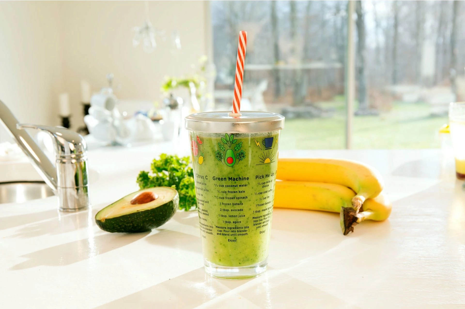 Jump-start your morning with an energizing and refreshing smoothie served in the Smoothie Recipe Glass by Kikkerland! Made of glass and stainless steel, this smoothie glass features 6 smoothie recipes so you can make a different delicious smoothie Monday through Friday! The Smoothie Recipe Glass includes a stainless steel lid and a fun red and white reusable straw, so you can take your beverage on the go. For an invigorating breakfast or afternoon pick-me-up, try the Smoothie Recipe Glass by Kikkerland today!