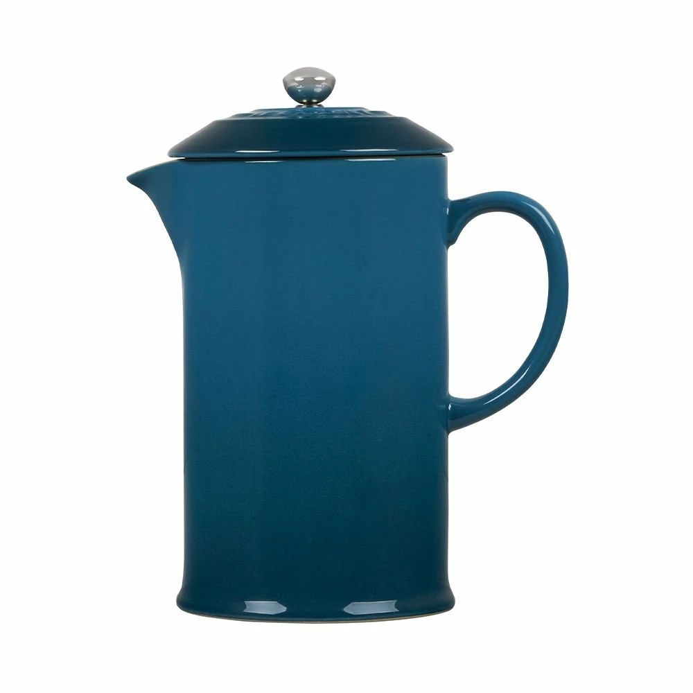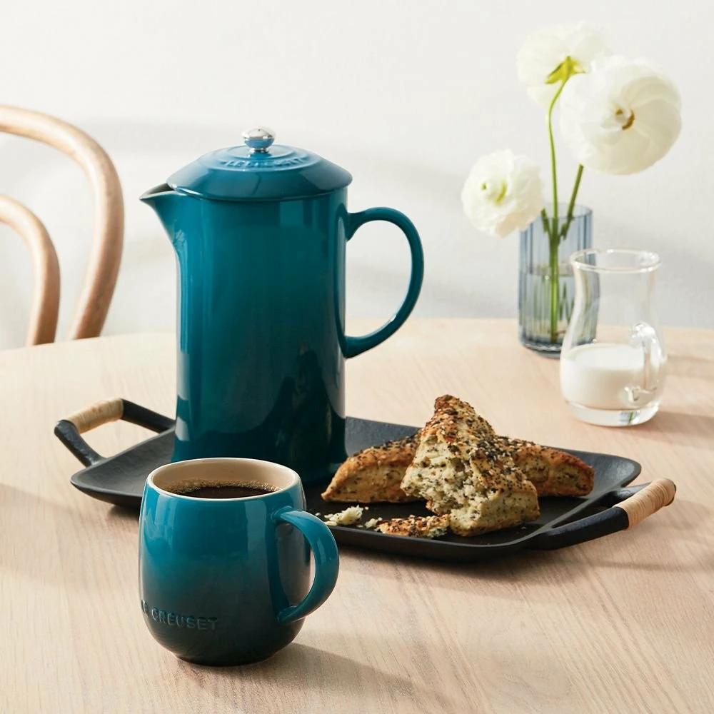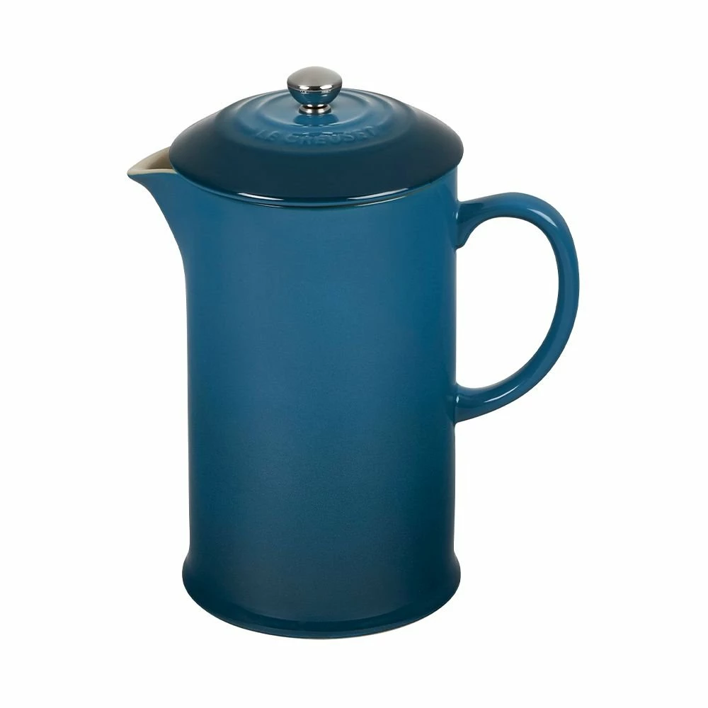 When you desire espresso with a deep richness in texture, aroma, and flavor, you likely seek out a French press as the optimum, traditional way of preparing that type coffee. The Le Creuset French Press Coffee Maker in Deep Teal can provide this classic, full-bodied espresso while you enjoy that signature kitchen style. This Le Creuset stoneware ceramic French press has an integrated, fine-holed, stainless steel sieve to hold your coffee for pressing.