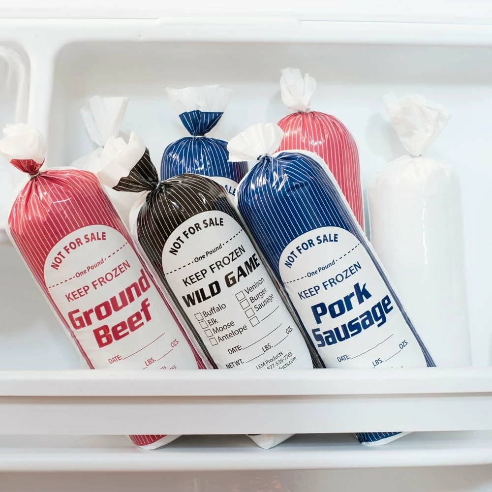 Store your ground beef easily and conveniently with the 1 lb. Ground Beef Poly Bags from LEM. With 25 bags in each pack, you can easily store several pounds of meat in the freezer. These polyethylene meat storage bags have a 1.5” bottom gusset for extra burst protection, keeping your freezer clean. The bags have a 2-millimeter thickness, which helps prevent freezer burn to keep your ground beef fresher, longer. Under “NOT FOR SALE” are the words “GROUND BEEF” printed in large, clear letters to help you easily organize and identify your meats in the freezer. The convenient labels allow you to denote the date of preparation and net weight so your freezer won’t collect outdated meat. Use LEM Poly Bag Tape Dispenser and Poly Bag Tape for a secure seal that will keep your ground beef fresh. Make sure your meats are stored safely, free from freezer burn, and the chance of bursting out of their bag with LEM’s 1 lb Ground Beef Poly Bags – 25 Count!