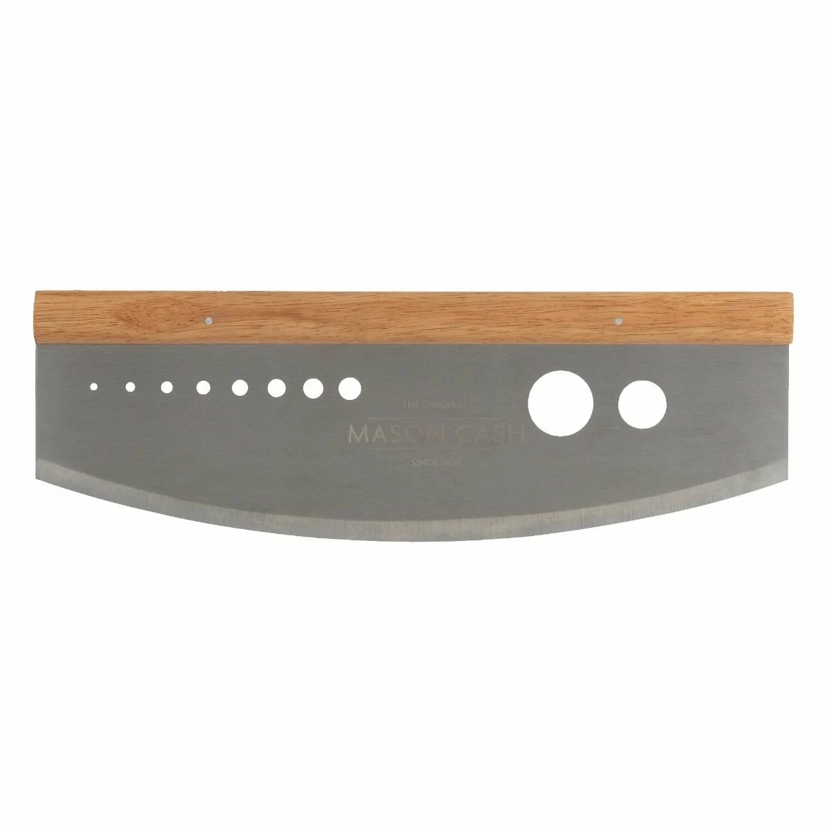 While the Mason Cash Innovative Kitchen collection offers various solutions for all sorts of kitchen needs, the Hachoir Pizza Cutter is a rock-solid pizza tool that will give you the edge in splitting your pie into quarters, sixths, or eighths! Made from a stainless steel blade with a wooden handle, its rounded edge enables you to slice not just pizza and flatbread, but it makes for a chop-worthy tool that will cut dough, herbs, and vegetables with an easy rocking motion. Conveniently, the blade features precision cutting holes for the measurements of one or two portions of spaghetti. It also comes with a series of holes for stripping different herbs. When you are done using the Pizza Cutter, just hand wash it in the sink with warm, soapy water and dry it immediately. To protect yourself and others, it comes with a safety guard for the blade that makes storing it away easy and harmless. Now cut to the quick on your meal prep tricks with the Mason Cash Innovative Kitchen Hachoir Pizza Cutter!