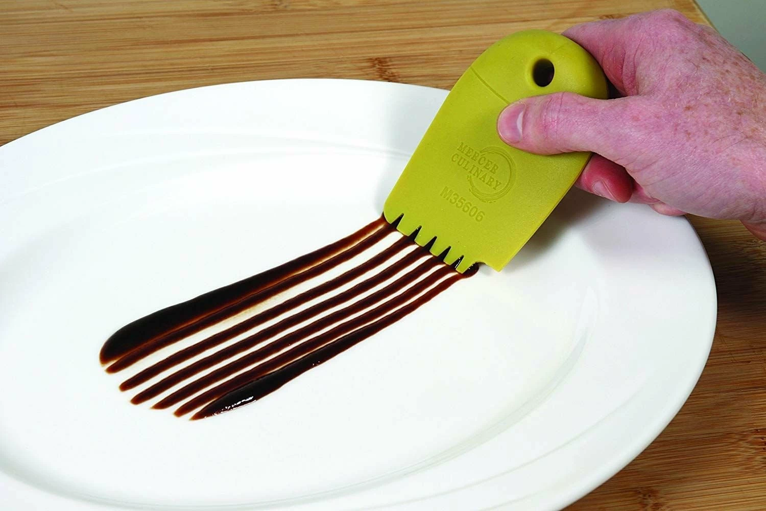 Experience a comfortable grip for better control with every expressive, creative brush stroke made gently or swiftly across a plate, bowl, or other dish with a wedge from the 8-Piece Silicone Assorted Plating Wedge Set by Mercer Culinary. It’s all from the recessed thumb grip and thoughtful, easy-to-use design. Even when hot off the pan, sauces and such are readily available for these wedges to easily use with the food-safe silicone material capable of withstanding temperatures reaching up to 480°F. Each wedge is of a different color – that way, you are able to differentiate between what is used for what. The convenient hanging hole makes it easy to keep them together for storage, but not before looping them through the included coated wire loop with threaded lock. Finish up by placing any of the wedges used into a dishwasher for simple cleanup. Give others a true culinary gift when dining out or dining in by allowing them to actually see just how truly amazing and beautiful food can be when purely imaginative designs are created with the Mercer Culinary 8-Piece Silicone Assorted Plating Wedge Set.