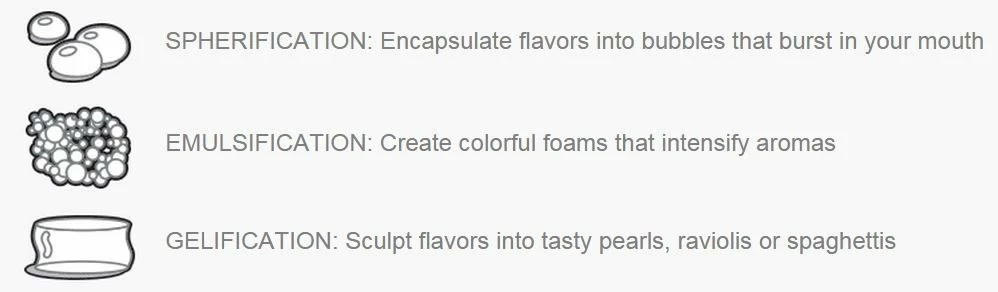 - Dress up meals with balsamic vinegar pearls, foamy emulsified lemon juice, chocolate spaghetti, & more