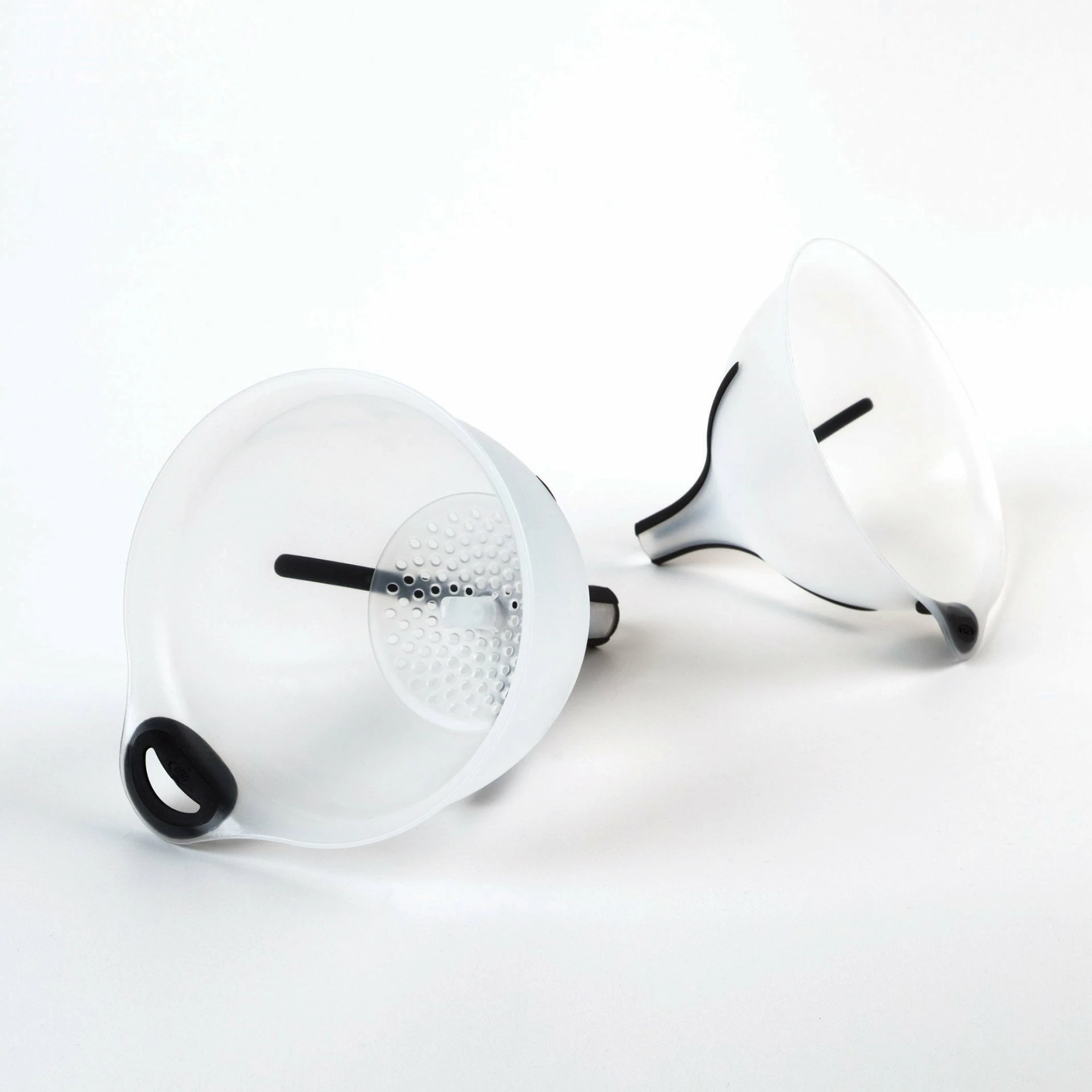 Strain anything from steam soups to homemade stocks with the 3 Piece Multi-Purpose Funnel Set from OXO. This set includes two funnels, one large and one small, and a strainer that works with both funnels. Made from high-heat plastic, these funnels are built to withstand hot or cold liquids effortlessly, and their design allows them to nest inside each other, for compact storage. With ribs along their exterior, these funnels fit securely in numerous bottle sizes, minimizing the mess and adding versatility and making this funnel set an invaluable part of your kitchen arsenal!