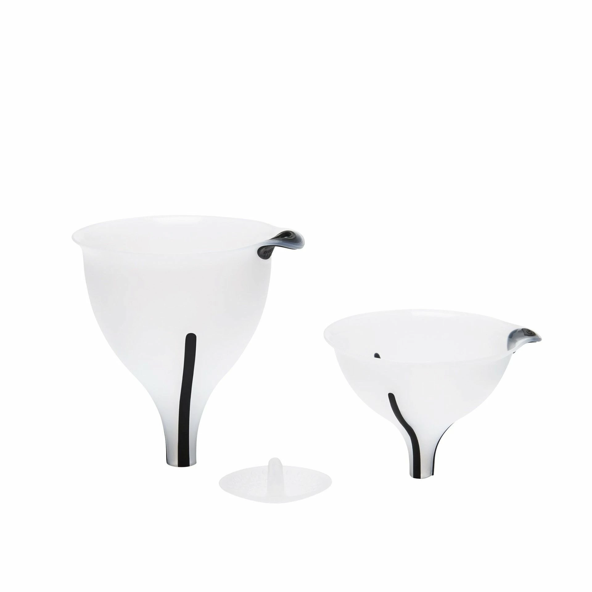 - Set includes large and small funnels and an interchangeable detachable strainer