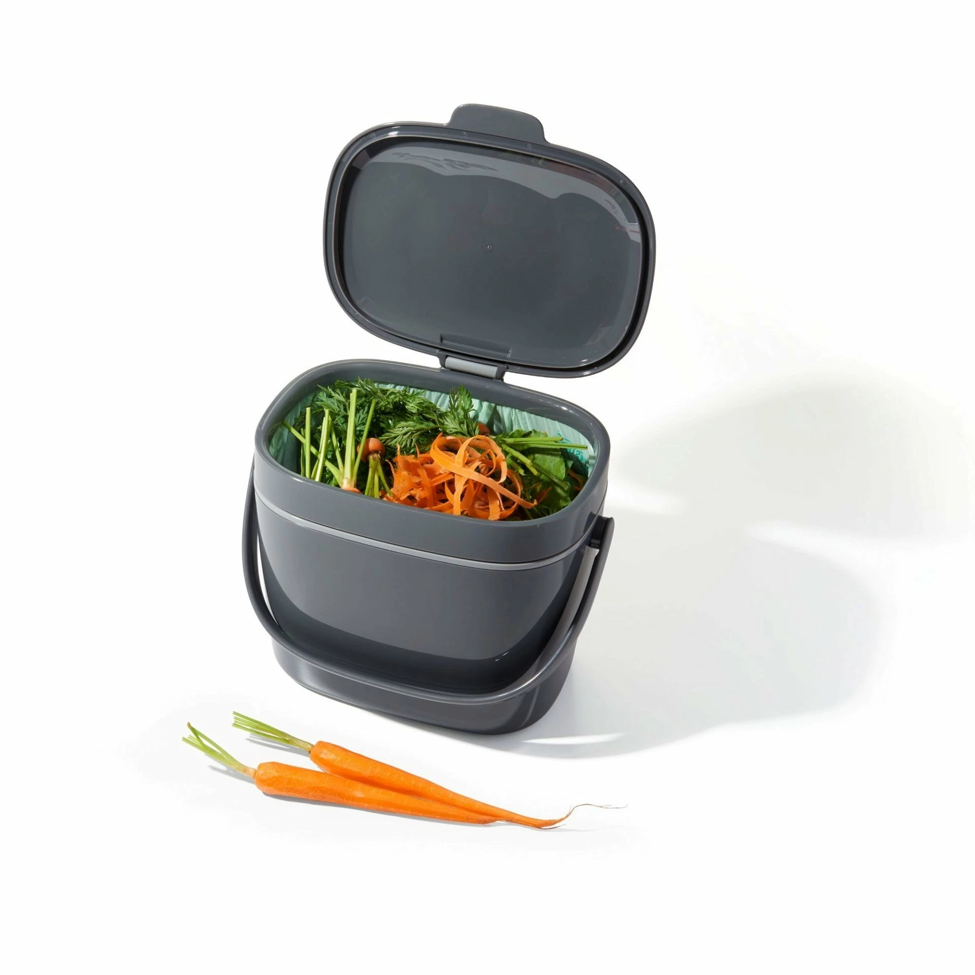 - Bin keeps composting bag out of sight for a clean look