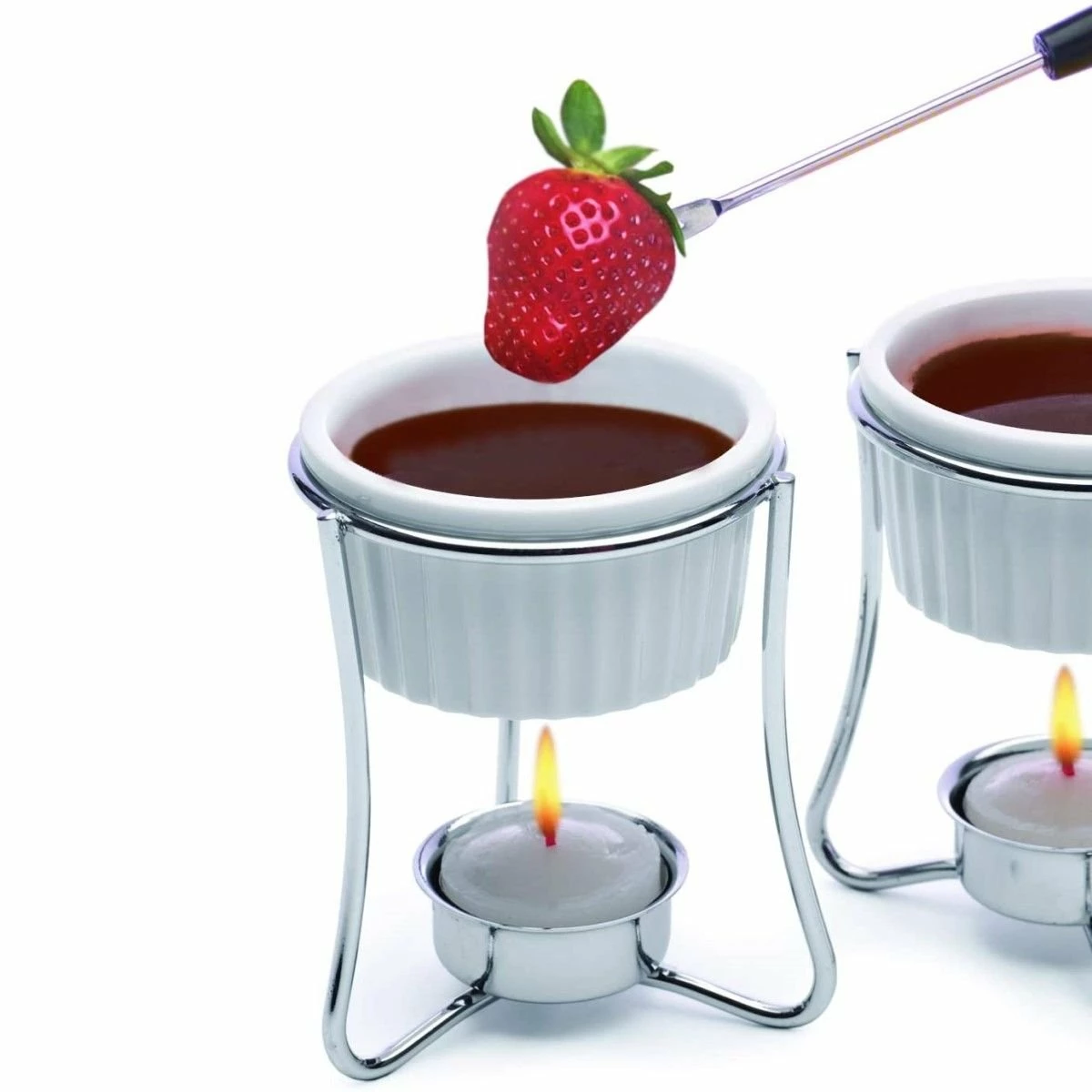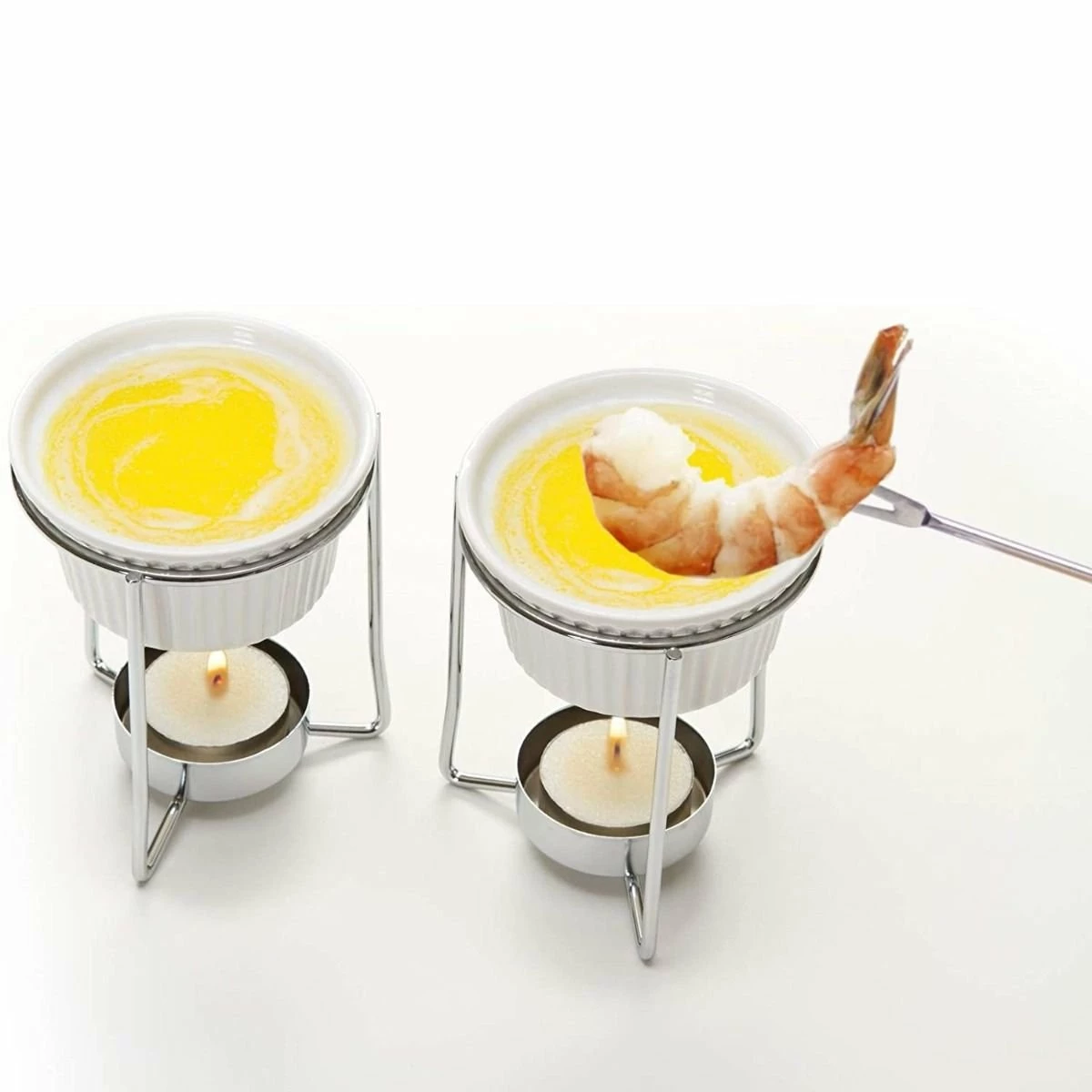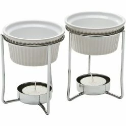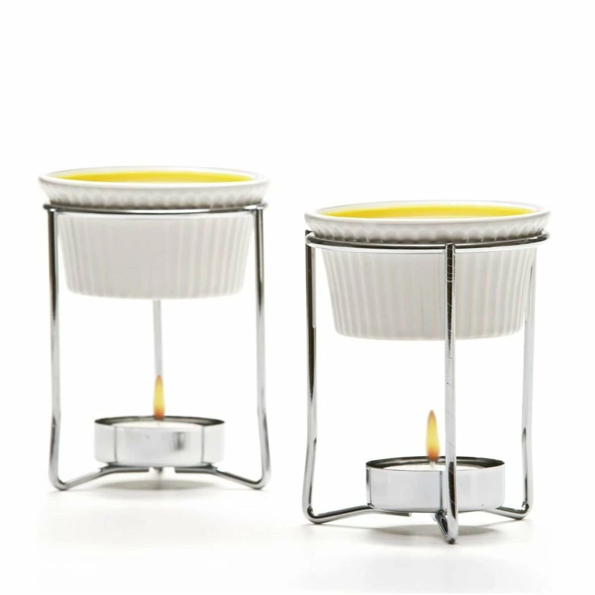 The Progressive butter warmers are classy additions to your seafood dinner. This set of two butter warmers is small enough to be perfect for individual servings. These butter warmers are made of ceramic and chrome and include a pair of tea light candles to warm your butter and add a romantic feel to your special dinner.