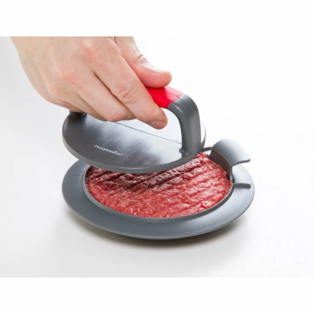 Love burgers on the grill, but hate to spend time hand-forming hamburger meat? The Progressive International Perfect Burger Press has the answer to eliminating some of the time and hassle it takes to make a bunch of burgers for a crowd of friends or family. This burger maker is a 3 piece set that includes comfort grip pusher, dimple insert, and non-skid base. The dimple insert creates an indention in the patty for faster cooking that also reduces the swelling that can occur during cooking making unsightly end results. But you can use the burger press without the dimple insert if you wish. Make fresh, drool-worthy burgers with this simple burger maker. The Progressive Perfect Burger Press will help you impress your friends on the grill with your professional looking burgers.