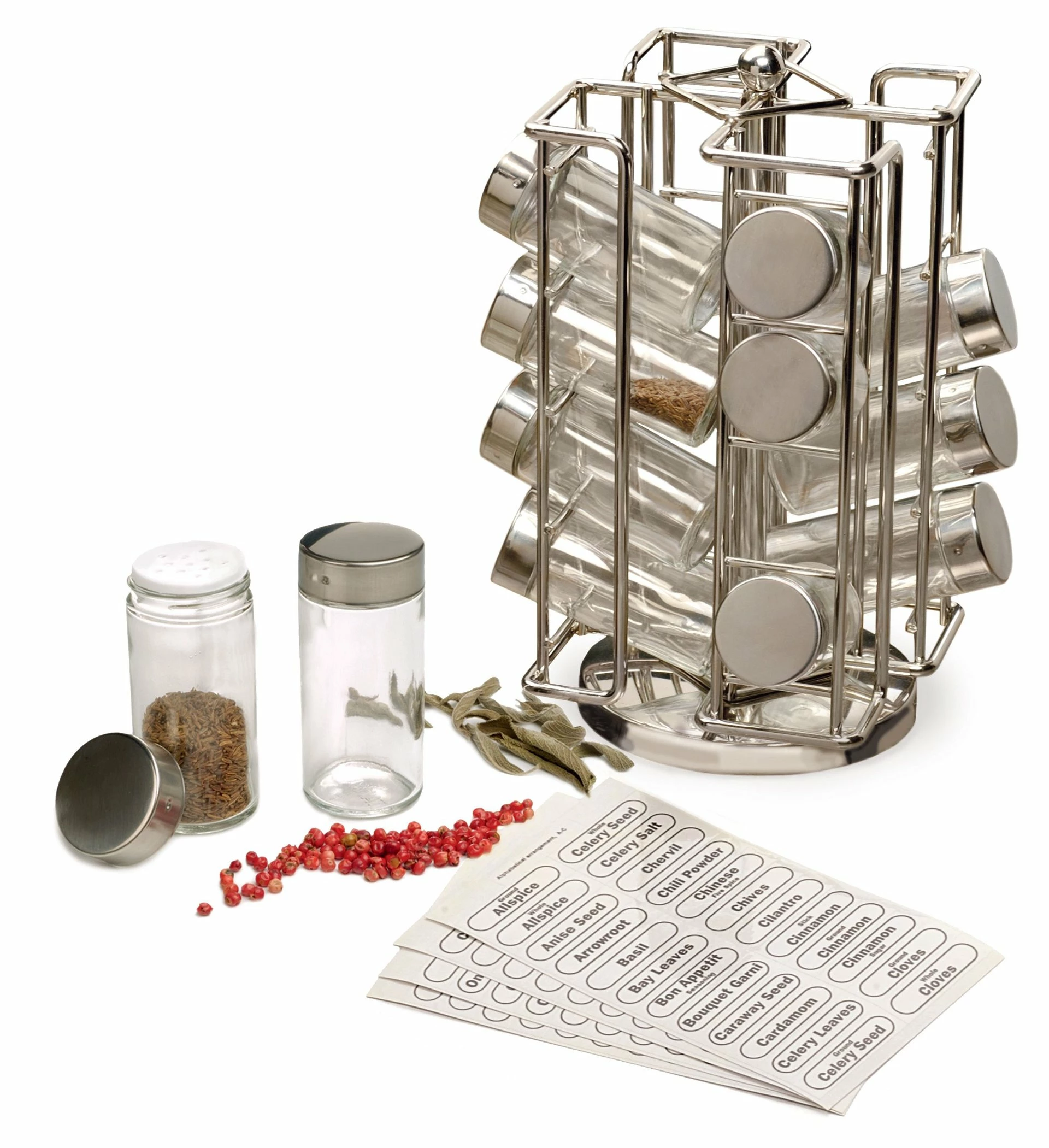 Cooking will be a breeze with this new RSVP Revolving Spice Rack Set taking up only 9” of your countertop or cabinet space. This spice rack set includes 12 clear glass spice jars with stainless steel lids and plastic shaker inserts. It also includes 96 clear spices and herbs labels. The polished chrome wire spice rack has a revolving base to make storage convenient for your kitchen space. Keep all your favorite spices and herbs within arm’s reach in your new RSVP Revolving Spice Rack Set and be ready for the heartfelt compliments of your guests.