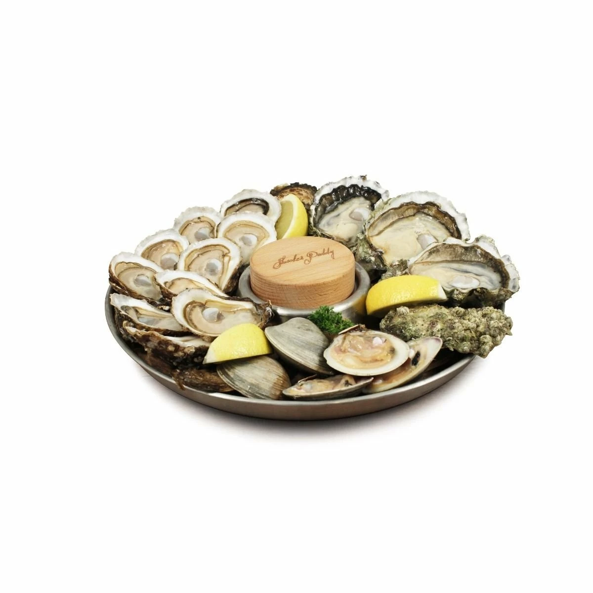 The world is your oyster, so celebrate birthdays, events, and special occasions with oysters on half-shells with the Swissmar Shucker Paddy 2-Piece Oyster Tray Set! Made from 0.8mm stainless steel, the Oyster Tray comes accompanied with a wooden puck called cleverly the Shucker Paddy. Just place the Shucker Paddy onto the middle of the tray to hold your oyster firmly as your shuck while the stainless steel Oyster Tray acts as a stabilizer and retains the shells and juices. Pop open that shell, and scrape your oyster for instant enjoyment! Before serving your oysters, it’s ideal to lay down a decent amount of crushed ice in your tray, and the tray approximately holds up to 24 oysters. What makes this Swissmar Oyster Tray with Shucker Paddy unique is that world-renowned shucker Patrick McMurray, the Guinness Record Holder of 38 oysters opened in one minute, designed this set to be used in your home! Impressed? Another great feature is that this Oyster Tray is oven-safe, which allows you to make baked Oysters Rockefeller or nachos topped with a dipping dish in the middle. When you are done using the Oyster Tray with Shucker Paddy, wash both pieces thoroughly by hand and dry immediately. Now go on and shuck and serve from the same tray with the Swissmar Shucker Paddy 2-Piece Oyster Tray Set!