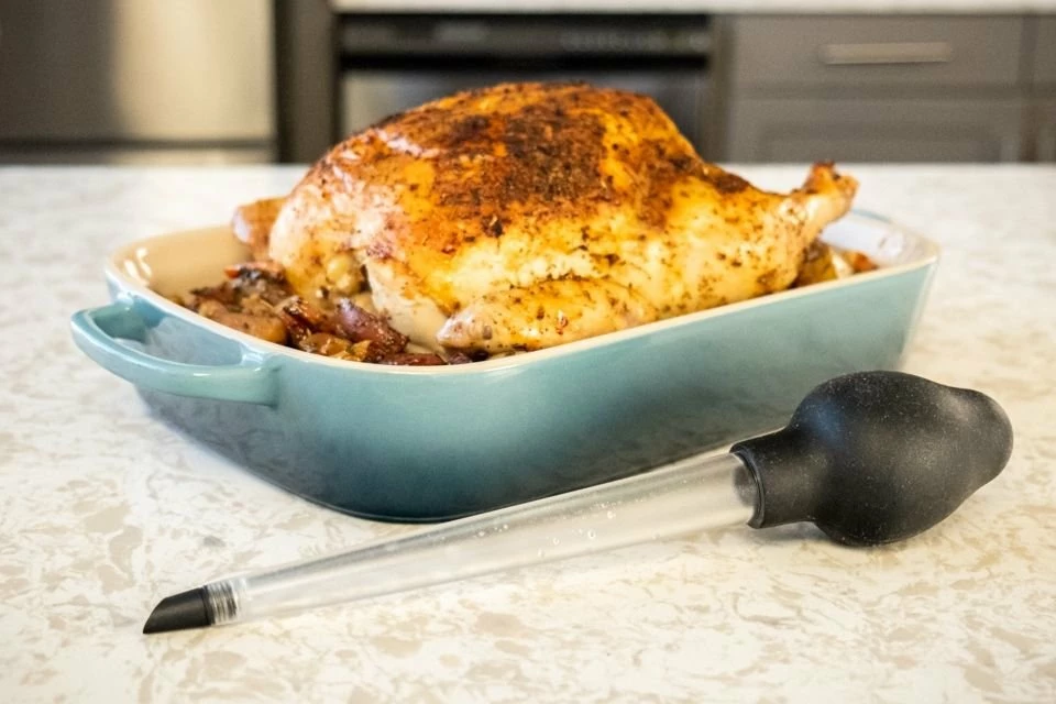 The Tovolo Turkey Baster lets you freely use your baster without leaving sloppy drips in your oven, on the stovetop, or all over the counter. Each design aspect of this baster will give you the best basting capacity without dripping a drop of liquid. From the bulb to the tip this baster is 11.5 inches long and fits perfectly into your hand. The bulb’s massive capacity allows for drawing more liquid. The long body of the baster comes in clear for easy viewing. This shiny design includes an internal valve system for dripless basting. The angled tip helps you cover an area evenly.