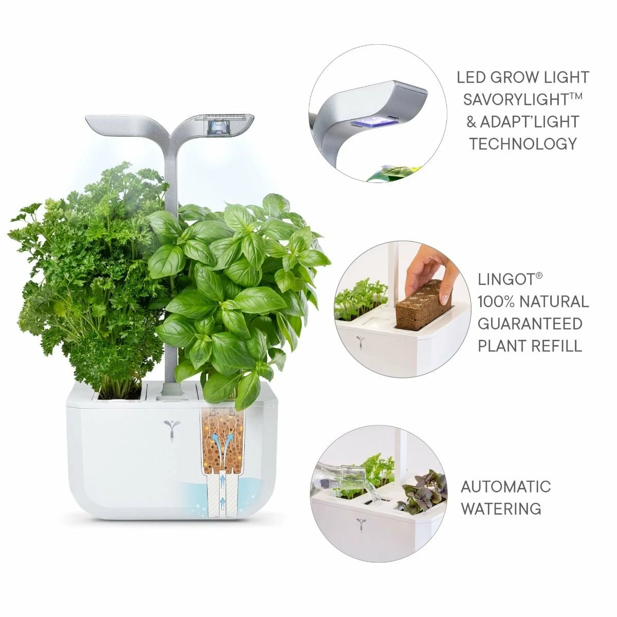 Growing a variety of fresh, aromatic herbs, fruits, and vegetables in the comfort of your home year-round is effortless with the Veritable® Exky® SMART Garden. This small and compact indoor gardening system is extremely efficient and perfect for use in any home or apartment without taking up too much space. With an elegant & beautiful Arctic White garden reservoir that’ll look stunning in your home, this indoor gardening system is 100% silent, fully autonomous, and comes with everything you need to get started on your indoor garden, including 2 ready-to-use pre-sown and nutrient-packed Lingots® in sweet basil & parsley. To use, simply plug-in your garden, fill the water reservoir, insert the Lingots®, and in 3-4 weeks, you’ll have fresh, aromatic herbs perfect for cooking or as lovely garnishes!
