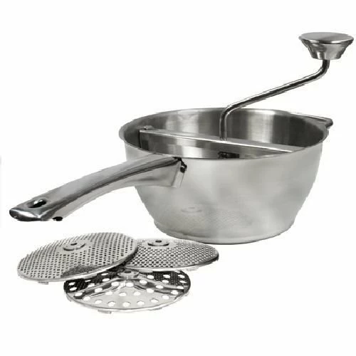 The Weston stainless-steel food mill is great for making sauces, purees, mashed potatoes, and baby foods. This food mill comes with three (3) stainless-steel milling discs that prevent pulp and skins from slipping through. This handy little food mill is also great for making soups, jams, and spaetzle.