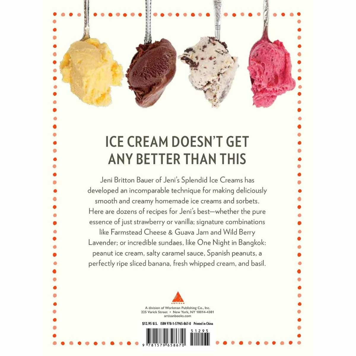 “Jeni Britton Bauer of Jeni’s Splendid Ice Creams has developed an incomparable technique for making deliciously smooth and creamy homemade ice creams and sorbets. Here are dozens of recipes for Jeni’s best—whether the pure essence of just strawberry or vanilla; signature combinations like Farmstead Cheese & Guava Jam and Wild Berry Lavender; or incredible sundaes, like One Night in Bangkok: peanut ice cream, salty caramel sauce, Spanish peanuts, a perfectly ripe sliced banana, fresh whipped cream, and basil.”